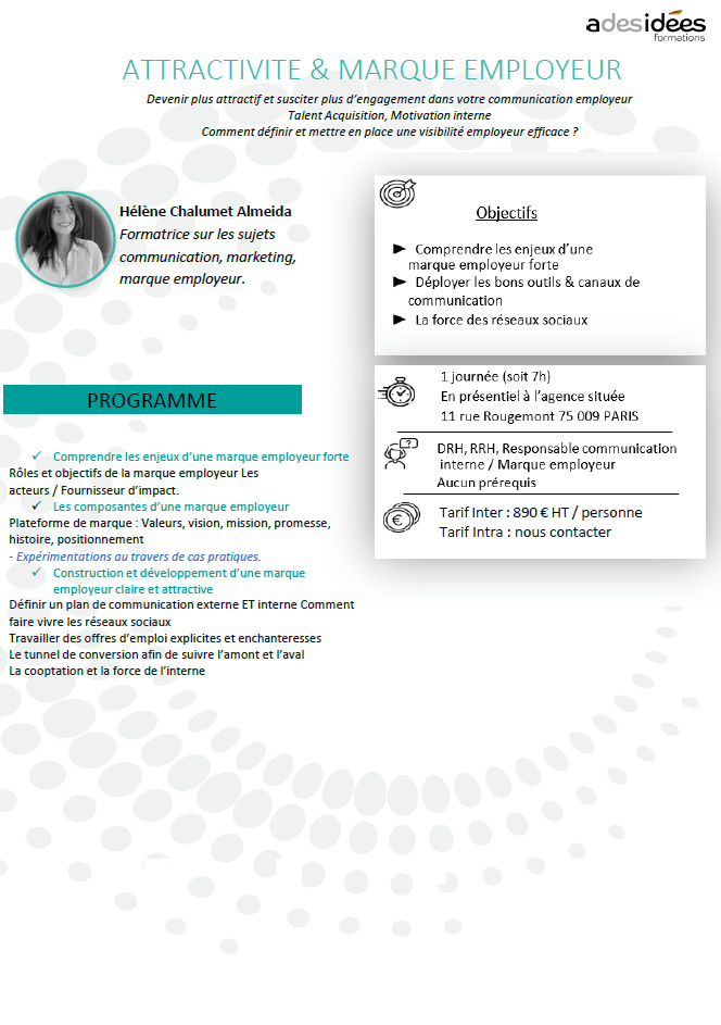 Attractivité et marque employeur Télécharger le programme S’inscrire Nous contacter Suivez-nous LinkedIn Facebook Twitter YouTube Besoin d’aide ? Notre ADNNos formationsNos référencesMarketez vos formations Contactez-nous 11, Rue Rougemont, 75009 Paris cl@adesideesrh.com 01 46 34 85 04 Découvrez notre agence