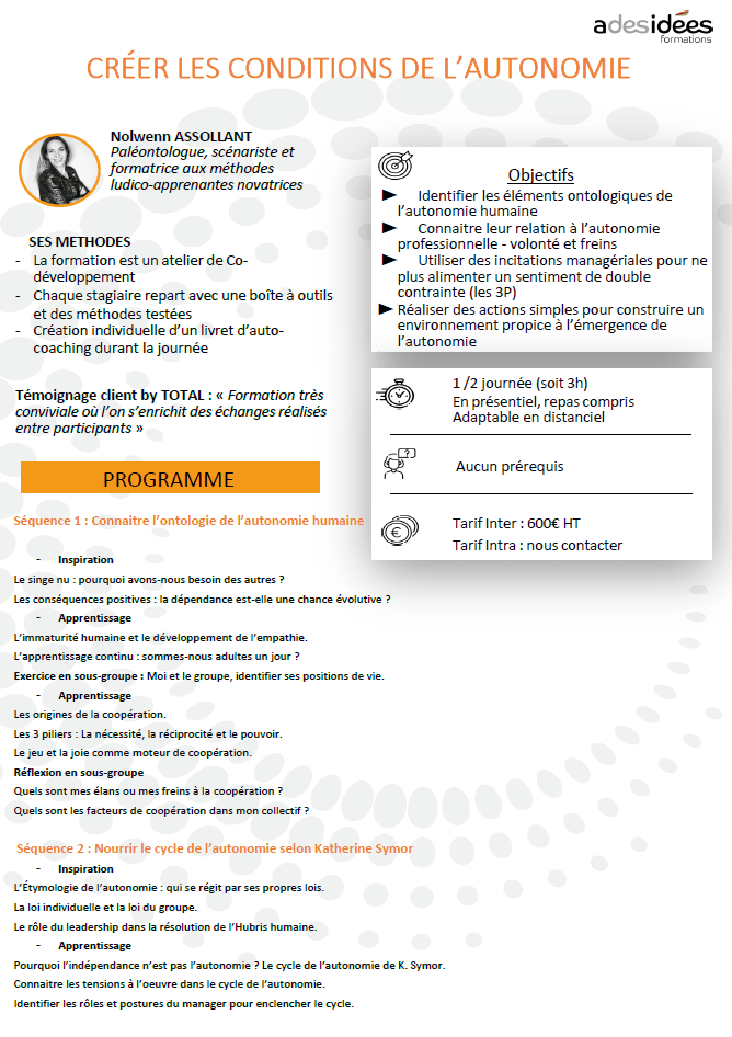 Créer les conditions de l’autonomie Télécharger le programme Présentation de Nolwenn BERNACHE-ASSOLLANT S’inscrire Nous contacter Suivez-nous LinkedIn Facebook Twitter YouTube Besoin d’aide ? Notre ADNNos formationsNos référencesMarketez vos formations Contactez-nous 11, Rue Rougemont, 75009 Paris cl@adesideesrh.com 01 46 34 85 04 Découvrez notre agence