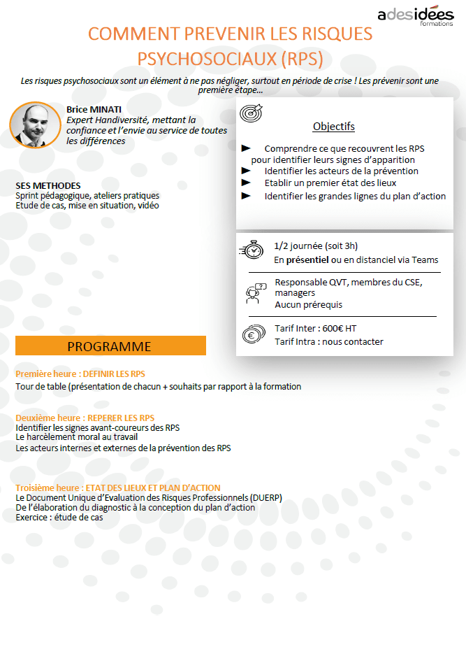 Comment prévenir les risques psychosociaux (RPS) Télécharger le programme S’inscrire Nous contacter Suivez-nous LinkedIn Facebook Twitter YouTube Besoin d’aide ? Notre ADNNos formationsNos référencesMarketez vos formations Contactez-nous 11, Rue Rougemont, 75009 Paris cl@adesideesrh.com 01 46 34 85 04 Découvrez notre agence