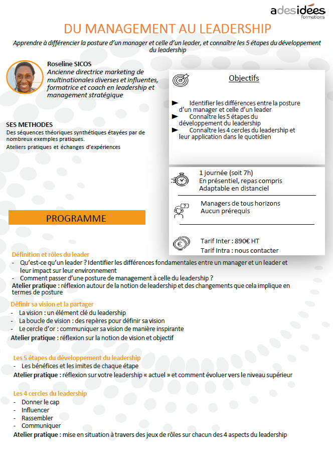 Du management au leadership Télécharger le programme S’inscrire Nous contacter Suivez-nous LinkedIn Facebook Twitter YouTube Besoin d’aide ? Notre ADNNos formationsNos référencesMarketez vos formations Contactez-nous 11, Rue Rougemont, 75009 Paris cl@adesideesrh.com 01 46 34 85 04 Découvrez notre agence