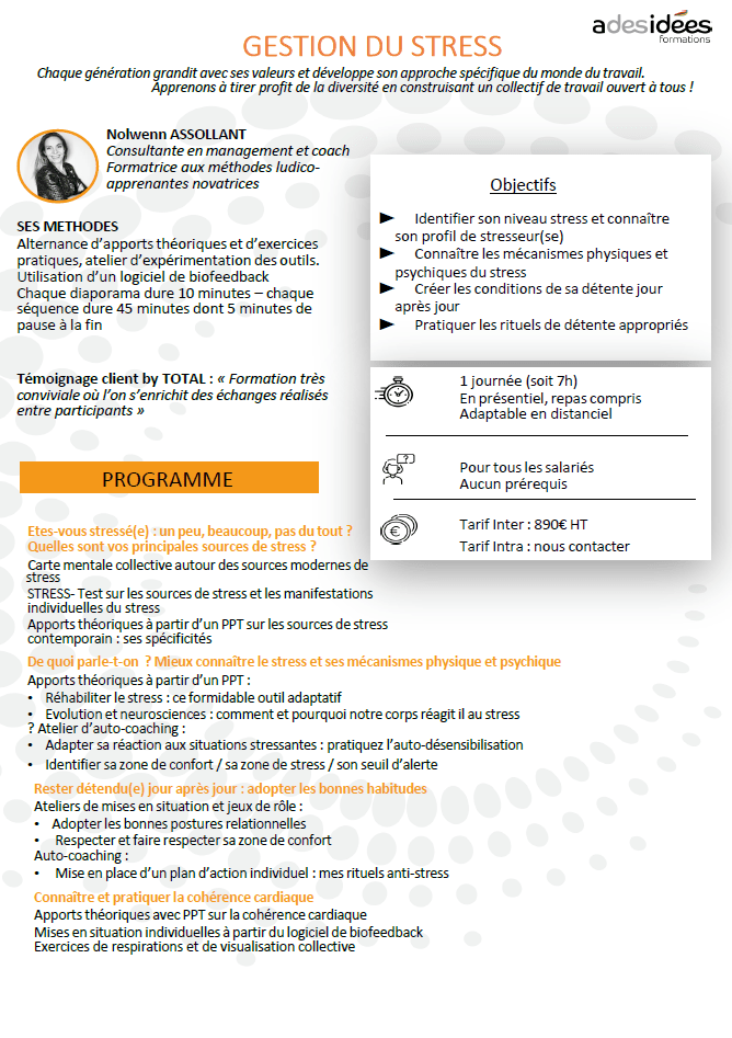 Gestion du stress Télécharger le programme Présentation de Nolwenn BERNACHE-ASSOLLANT S’inscrire Nous contacter Suivez-nous LinkedIn Facebook Twitter YouTube Besoin d’aide ? Notre ADNNos formationsNos référencesMarketez vos formations Contactez-nous 11, Rue Rougemont, 75009 Paris cl@adesideesrh.com 01 46 34 85 04 Découvrez notre agence