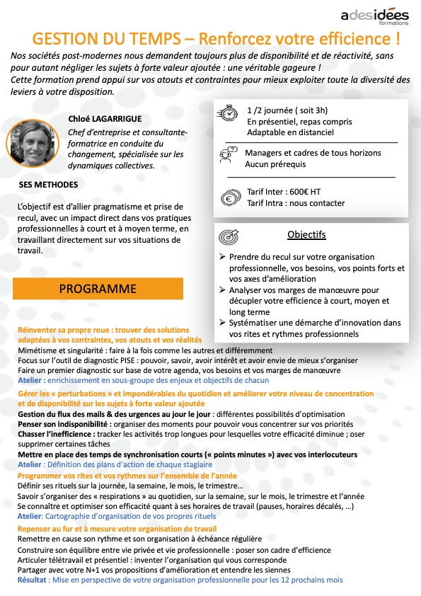 Gestion du temps – renforcez votre efficience Télécharger le programme Présentation de Chloé LAGARRIGUE Nous contacter Suivez-nous LinkedIn Facebook Twitter YouTube Besoin d’aide ? Notre ADNNos formationsNos référencesMarketez vos formations Contactez-nous 11, Rue Rougemont, 75009 Paris cl@adesideesrh.com 01 46 34 85 04 Découvrez notre agence