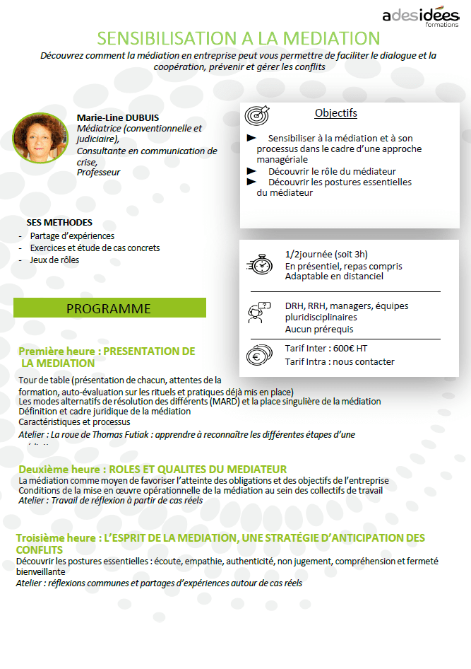 Sensibilisation à la médiation Télécharger le programme S’inscrire Nous contacter Suivez-nous LinkedIn Facebook Twitter YouTube Besoin d’aide ? Notre ADNNos formationsNos référencesMarketez vos formations Contactez-nous 11, Rue Rougemont, 75009 Paris cl@adesideesrh.com 01 46 34 85 04 Découvrez notre agence