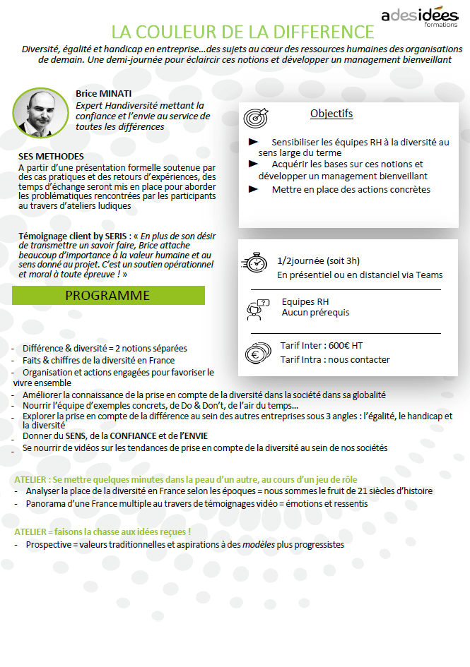 La couleur de la différence Télécharger le programme S’inscrire Nous contacter Suivez-nous LinkedIn Facebook Twitter YouTube Besoin d’aide ? Notre ADNNos formationsNos référencesMarketez vos formations Contactez-nous 11, Rue Rougemont, 75009 Paris cl@adesideesrh.com 01 46 34 85 04 Découvrez notre agence