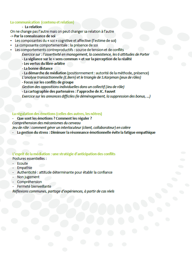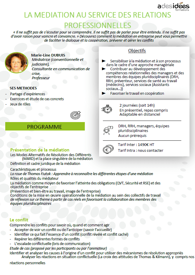 La médiation au service des relations professionnelles Télécharger le programme S’inscrire Nous contacter Suivez-nous LinkedIn Facebook Twitter YouTube Besoin d’aide ? Notre ADNNos formationsNos référencesMarketez vos formations Contactez-nous 11, Rue Rougemont, 75009 Paris cl@adesideesrh.com 01 46 34 85 04 Découvrez notre agence