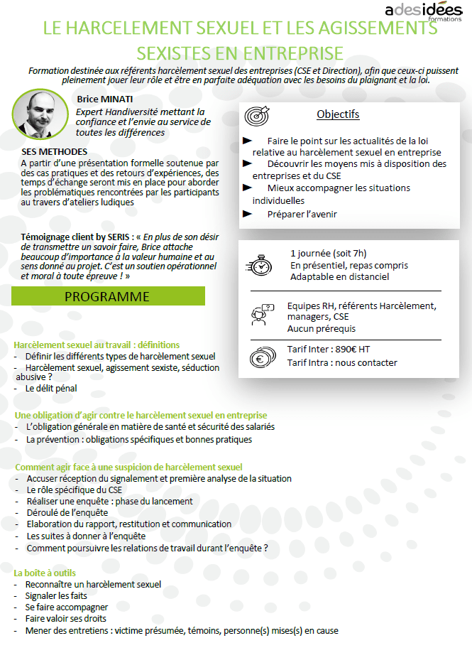 Le harcèlement sexuel en entreprise Télécharger le programme S’inscrire Nous contacter Suivez-nous LinkedIn Facebook Twitter YouTube Besoin d’aide ? Notre ADNNos formationsNos référencesMarketez vos formations Contactez-nous 11, Rue Rougemont, 75009 Paris cl@adesideesrh.com 01 46 34 85 04 Découvrez notre agence