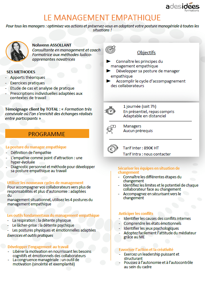 Le management empathique Télécharger le programme Présentation de Nolwenn BERNACHE-ASSOLLANT S’inscrire Nous contacter Suivez-nous LinkedIn Facebook Twitter YouTube Besoin d’aide ? Notre ADNNos formationsNos référencesMarketez vos formations Contactez-nous 11, Rue Rougemont, 75009 Paris cl@adesideesrh.com 01 46 34 85 04 Découvrez notre agence