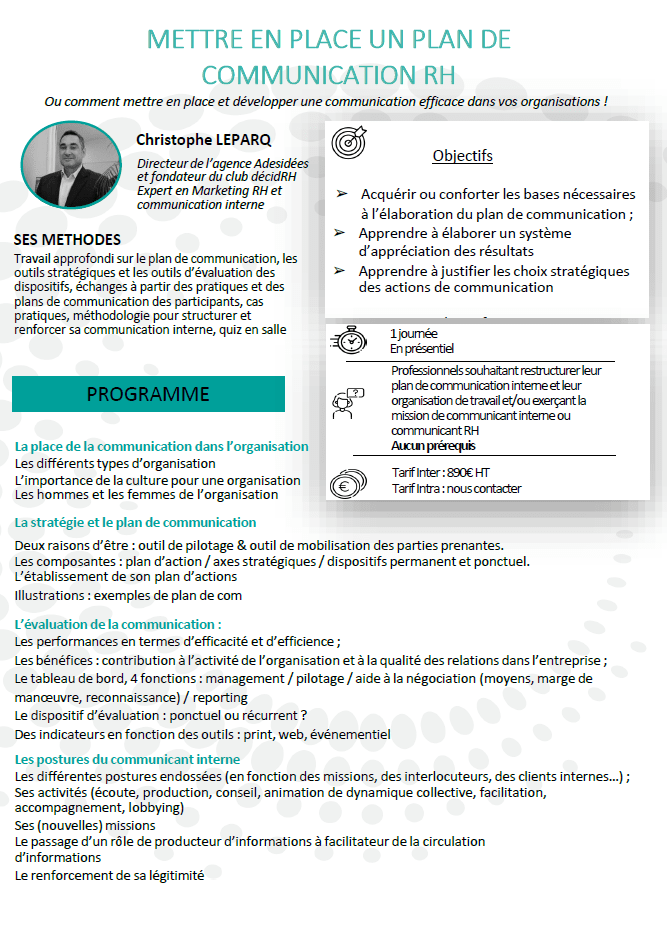 Plan de communication RH Télécharger le programme Présentation de Christophe LEPARQ S’inscrire Nous contacter Suivez-nous LinkedIn Facebook Twitter YouTube Besoin d’aide ? Notre ADNNos formationsNos référencesMarketez vos formations Contactez-nous 11, Rue Rougemont, 75009 Paris cl@adesideesrh.com 01 46 34 85 04 Découvrez notre agence