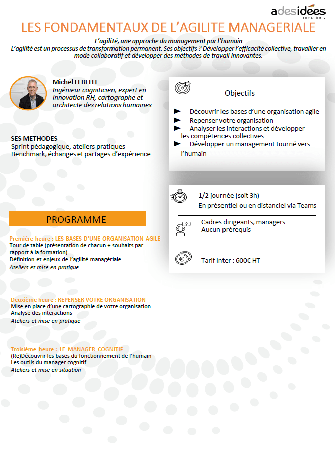 Les fondamentaux de l’agilité managériale Télécharger le programme S’inscrire Nous contacter Suivez-nous LinkedIn Facebook Twitter YouTube Besoin d’aide ? Notre ADNNos formationsNos référencesMarketez vos formations Contactez-nous 11, Rue Rougemont, 75009 Paris cl@adesideesrh.com 01 46 34 85 04 Découvrez notre agence