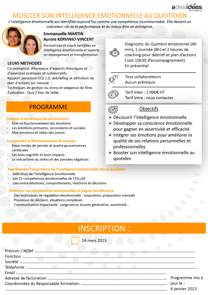 Muscler son intelligence émotionnelle au quotidien – INTER Télécharger le programme S’INSCRIRE À LA FORMATION Suivez-nous LinkedIn Facebook Twitter YouTube Besoin d’aide ? Notre ADNNos formationsNos référencesMarketez vos formations Contactez-nous 11, Rue Rougemont, 75009 Paris cl@adesideesrh.com 01 46 34 85 04 Découvrez notre agence