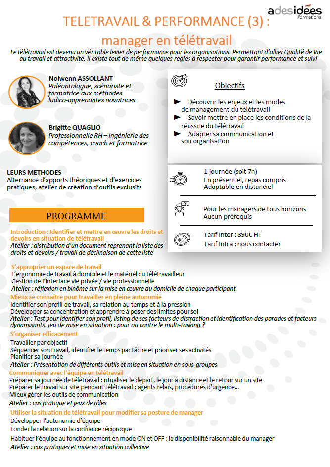 Télétravail et Performance: manager en situation de télétravail Télécharger le programme Présentation de Nolwenn BERNACHE-ASSOLLANT S’inscrire Nous contacter Suivez-nous LinkedIn Facebook Twitter YouTube Besoin d’aide ? Notre ADNNos formationsNos référencesMarketez vos formations Contactez-nous 11, Rue Rougemont, 75009 Paris cl@adesideesrh.com 01 46 34 85 04 Découvrez notre agence