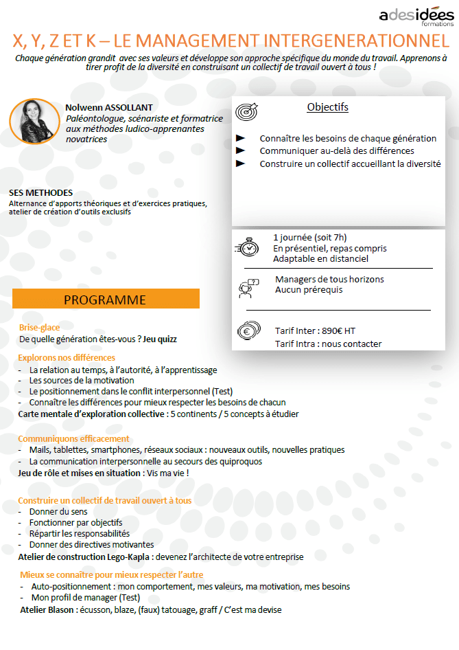 X,Y,Z et K – Management Intergénérationnel Télécharger le programme Présentation de Nolwenn BERNACHE-ASSOLLANT S’inscrire Nous contacter Suivez-nous LinkedIn Facebook Twitter YouTube Besoin d’aide ? Notre ADNNos formationsNos référencesMarketez vos formations Contactez-nous 11, Rue Rougemont, 75009 Paris cl@adesideesrh.com 01 46 34 85 04 Découvrez notre agence